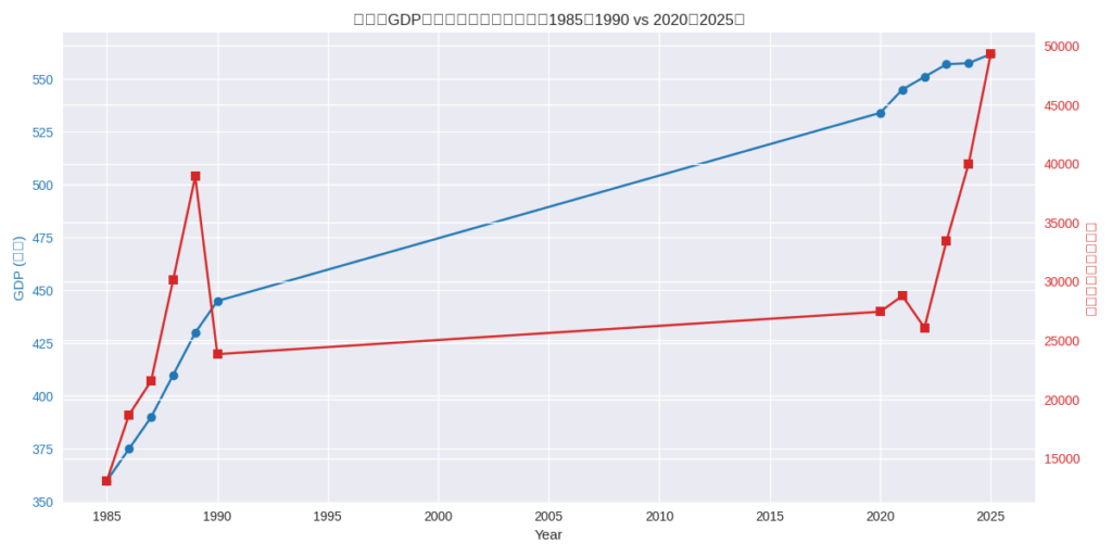 現代(2020〜2025):GDPは横ばいで停滞気味だが、株価は49,000円超とバブル期を大きく突破。