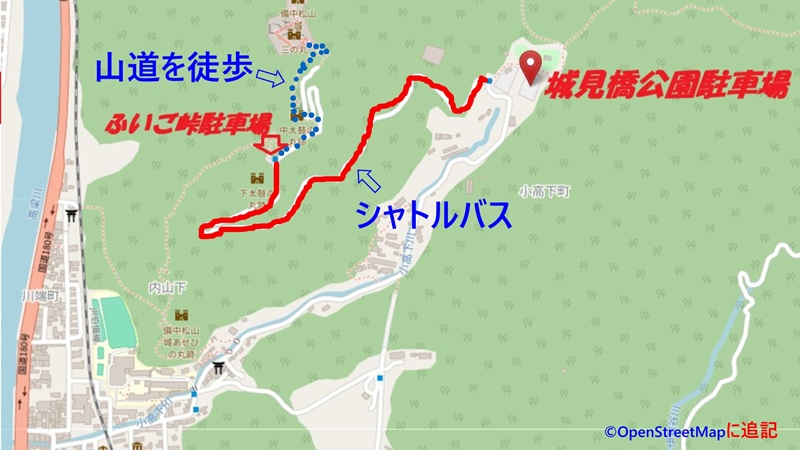 当日は、手前の 城見橋公園駐車場 までしか行けず そこからシャトルバスで 近くの ふいご峠駐車場 まで行きます